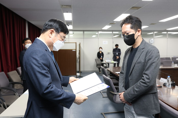 | ▲지난 25일 구청 간송홀에서 이동진 도봉구청장(왼쪽)이 구 마을미디어 지원 위원회 개최 위촉장을 수여하고 있다.(사진제공=도봉구청) |