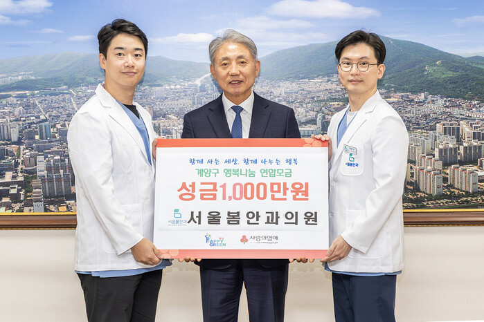 [인천=문찬식 기자] 인천 계양구(구청장 윤환)는 지난 21일, 서울봄안과의원이 이웃 돕기 성금 1,000만 원을 기탁했다고 밝혔다.