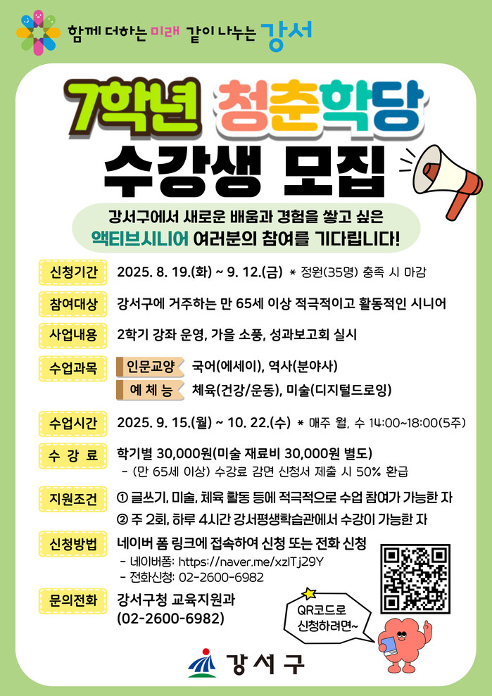 | ▲ ‘7학년 청춘학당’ 2학기 수강생 모집 포스터. (사진=강서구청 제공) |