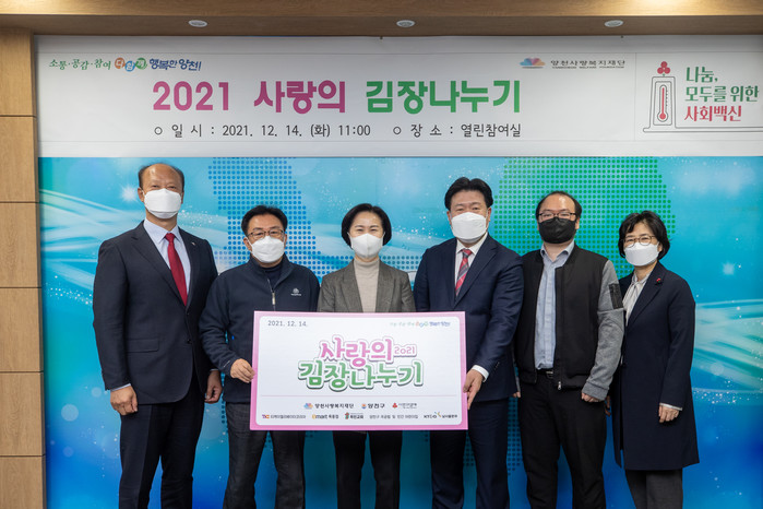 서울 양천구는 기업(티케이엘리베이터코리아· KT&G 남서울본부·이마트 목동점) 및 지역내 단체, 종교기관(목민·대한·강성·한성 교회) 등으로부터 7020만원을 기부받았다. 기부금 전액은 양천사랑복지재단을 통해 김장김치 구입비로 사용된다. 사진은 14일 열린 기부금 전달식에서 김수영 구청장(왼쪽 세 번째)과 관계자들이 기념촬영하는 모습. (사진제공=양천구청)
