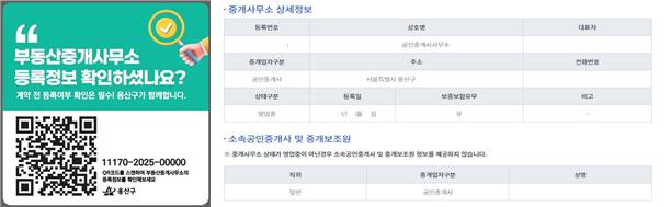 [시민일보 = 문민호 기자] 용산구(구청장 박희영)는 정보무늬(QR코드)를 활용해 부동산중개사무소 등록정보를 비대면으로 확인할 수 있는 ‘부동산중개사무소 등록정보 확인 서비스’를 본격 추진한다고 7일 밝혔다.