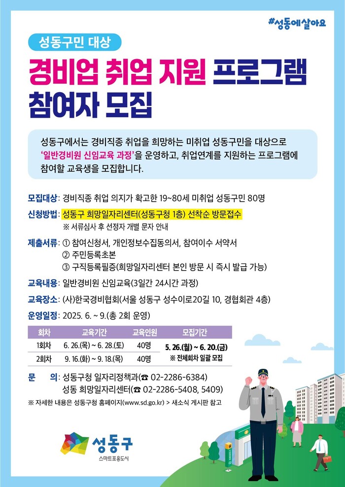 [시민일보 = 박소진 기자] 성동구(구청장 정원오)가 경비업종에 취업을 희망하는 구직자를 위한 ‘경비업 취업 지원 프로그램’을 운영한다.
