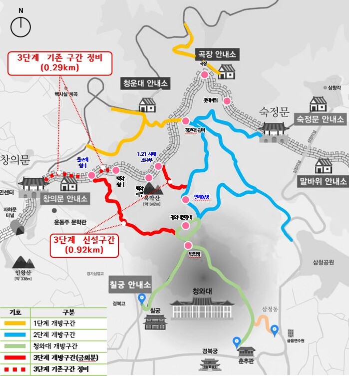 한편 구는 2020년 한양도성 밖(북측사면)에서 1단계 사업을, 2021~2022년 한양도성 안(남측사면)과 백악정 일원에서 2단계 사업을 추진해 탐방로를 신설한 바 있다.