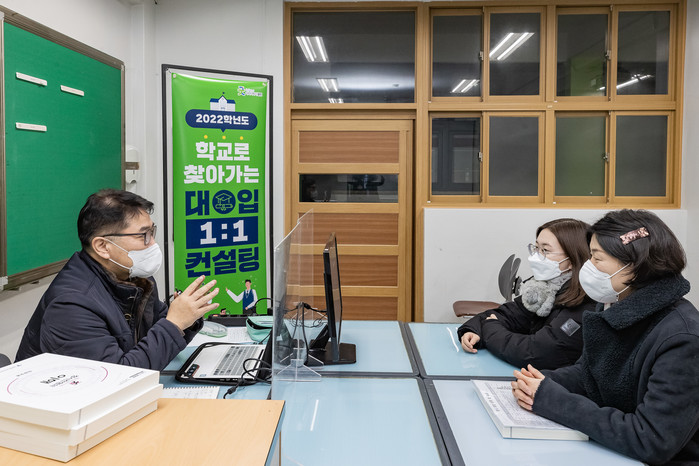 서울 광진구가 27~28일 양일간 2022학년도 대입 정시 지원 전략 수립을 위한 ‘학교로 찾아가는 1:1 컨설팅’을 진행했다. 컨설팅에는 서울시교육청 대학진학지도지원단 소속 현직 교사 33명이 상담자로 참여했으며, 컨설팅 대상은 광남고, 자양고등 일반 고등학교 6개교의 학생 140명이다. 사진은 교사가 학생 및 학부모와 상담을 하고 있는 모습. (사진제공=광진구청)