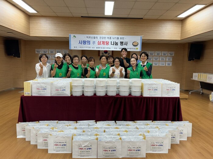‘사랑의 효(孝) 삼계탕 나눔 행사’는 홀몸 어르신과 취약계층 100가구에 부녀회원들이 직접 끓인 삼계탕과 수건, 물티슈, 생수 등을 담은 꾸러미를 전달했다.