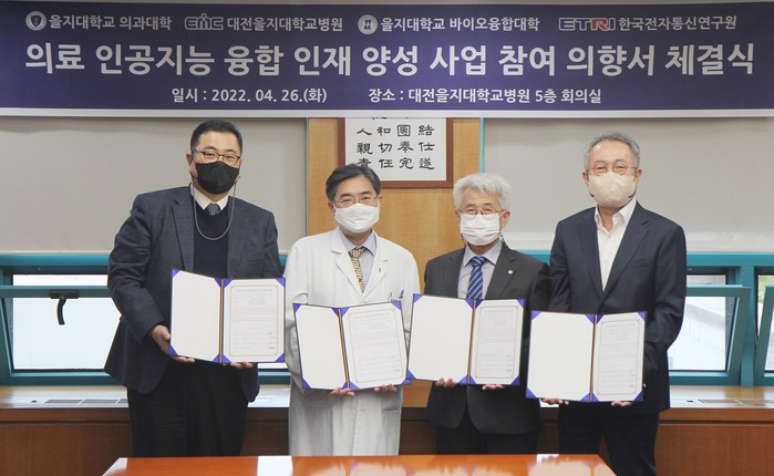 을지대학교 의과대학(학장 유승민)이 을지대 바이오융합대학(학장 정동근)과 대전을지대학교병원(원장 김하용), 한국전자통신연구원(원장 김명준, 이하 ETRI)과 함께 보건복지부와 한국보건산업진흥원이 실시하는 ‘의료 인공지능 융합 인재 양성 사업단’ 모집에 참여한다.