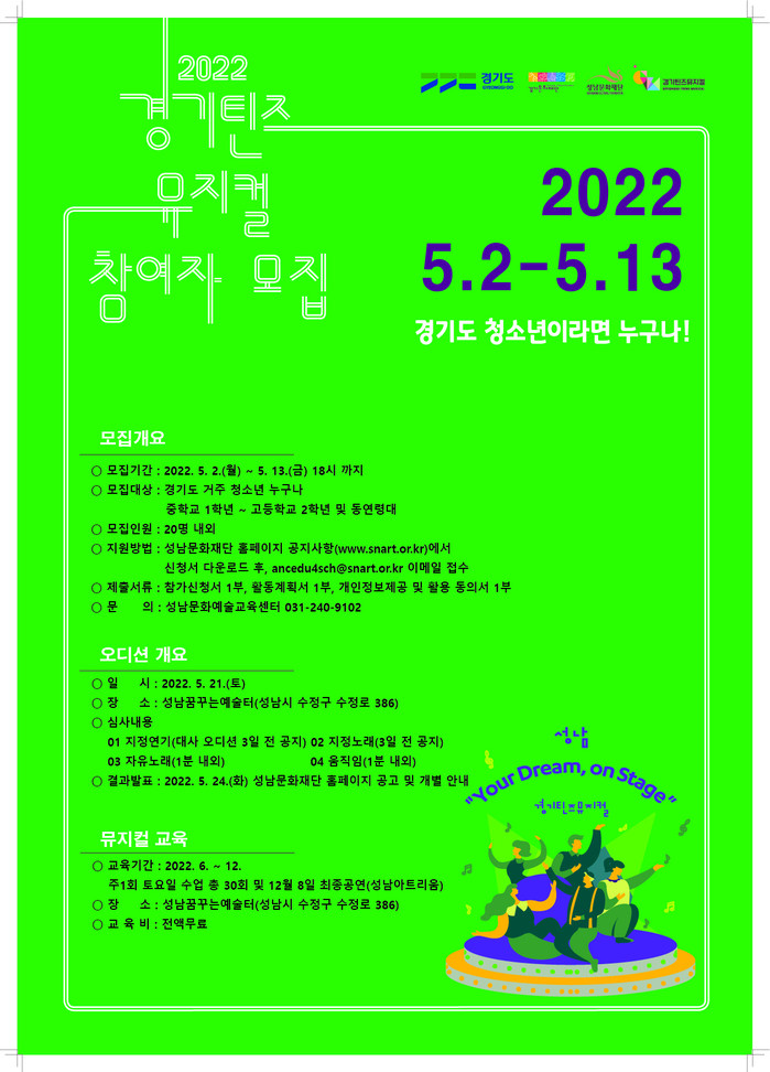 ‘2022 경기틴즈뮤지컬 성남’에 참가를 원하는 청소년은 성남문화재단 홈페이지에서 신청서를 내려받아 이메일로 5월 13일 18시까지 접수하면 된다