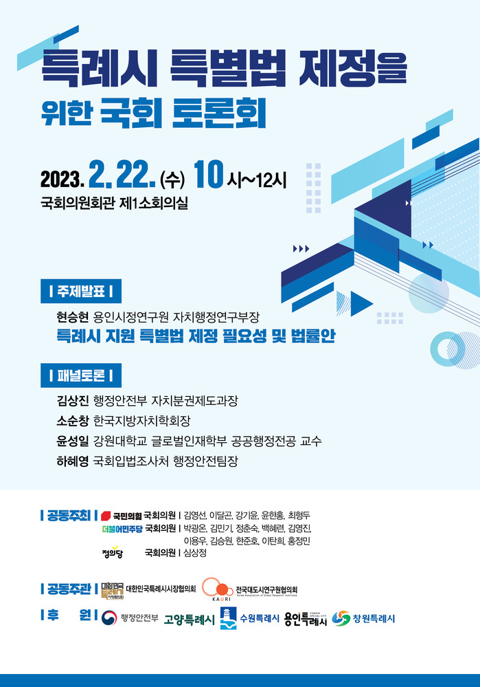 정책토론회는 대한민국특례시시장협의회(회장 이상일 용인특례시장)와 전국대도시연구원협의회가 공동 주관하고, 국회의원 김영선ㆍ이달곤ㆍ강기윤ㆍ윤한홍ㆍ최형두(이상 국민의 힘), 박광온ㆍ김민기ㆍ정춘숙ㆍ백혜련ㆍ김영진ㆍ이용우ㆍ김승원ㆍ한준호ㆍ이탄희ㆍ홍정민(이상 더불어민주당), 심상정(정의당) 이 공동주최한다.