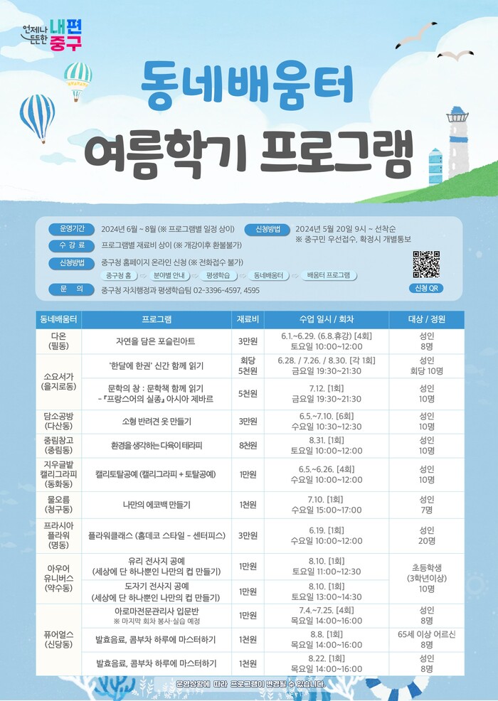 [시민일보 = 여영준 기자] 중구는 동네배움터 여름학기 프로그램 수강생을 모집하고 있다고 밝혔다.