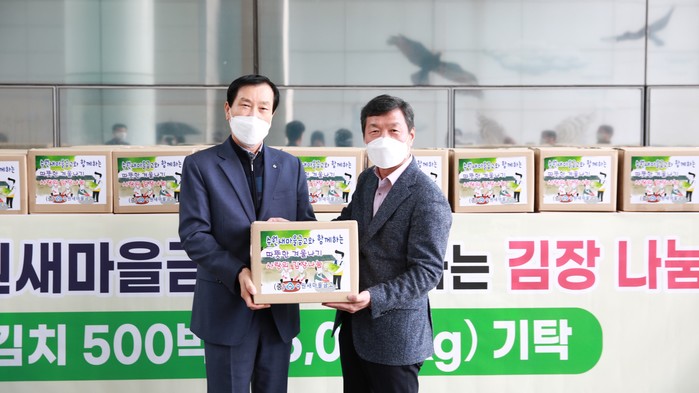 경기 수원시 장안구가 30일 MG수원새마을금고로부터 김장김치 500상자(5000kg·2000만원 상당)를 기부받았다. 사진은 전달식에서 왕철호 구청장(오른쪽)과 관계자가 기념촬영을 하는 모습. (사진제공=장안구청)