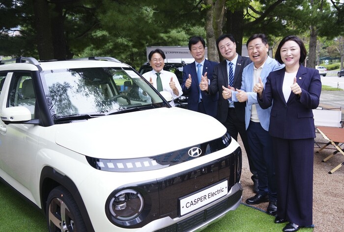 [광주=정찬남 기자]강기정 광주광역시장과 김관영 전북특별자치도지사, 박균택·조계원·전진숙 국회의원이 2일 오전 서울 국회의원회관 야외에 마련된 캐스퍼 전기차(EV) 전시장에서 캐스퍼EV의 강점을 설명들은 뒤 엄지척을 하고 있다./광주광역시 제공