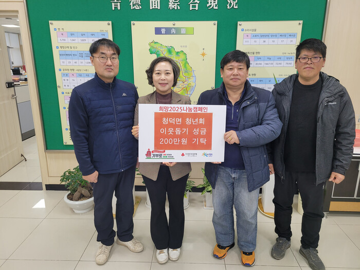 이에 이은숙 청덕면장은 “매년 변함없이 나눔을 실천해주시는 청년회 회원분들께 감사드리며, 기탁된 성금은 어려운 이웃들을 위해 소중히 사용하겠다”고 전했다.