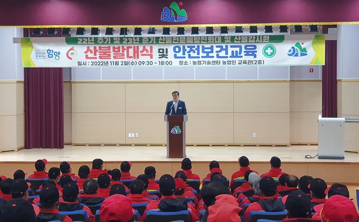 군은 2일 농업기술센터 농업인교육관에서 22년 추기 및 23년 춘기 산불전문예방진화대 및 산불감시원 발대식 및 안전보건교육을 실시했다.