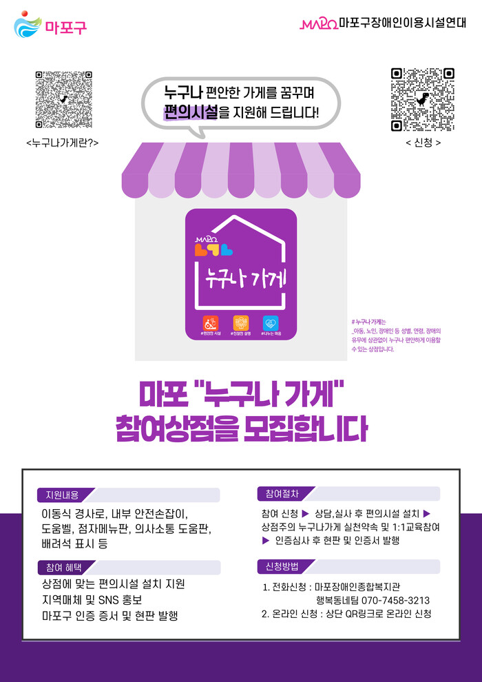 편의시설 설치가 완료된 상점은 장애 유무와 관계없이 모든 사람이 편안하고 안전하게 상점을 이용할 수 있음을 인증하는 마포형 무장애 상점 인증제인 ‘누구나 가게’ 인증을 받을 수 있다.