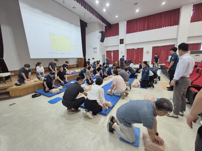 경기 오산시 보건소는 응급상황에서 급성심정지 환자 생존율을 높이기 위해 상시근로자 300인 이상 사업장 근로자 등 11곳을 대상으로 ‘찾아가는 심폐소생술 응급처치 교육’을 실시한다. 사진은 최근 오산경찰서에서 심폐소생술 교육을 진행하고 있는 모습. (사진=오산시청 제공)