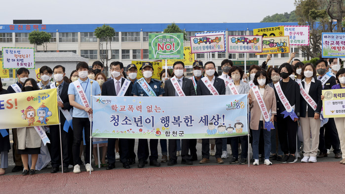 합천군(군수 권한대행 부군수 이선기)은 청소년의 달을 맞아 12일 합천중학교 앞에서 민‧관합동으로 등굣길 학교폭력예방 캠페인을 실시하였다.