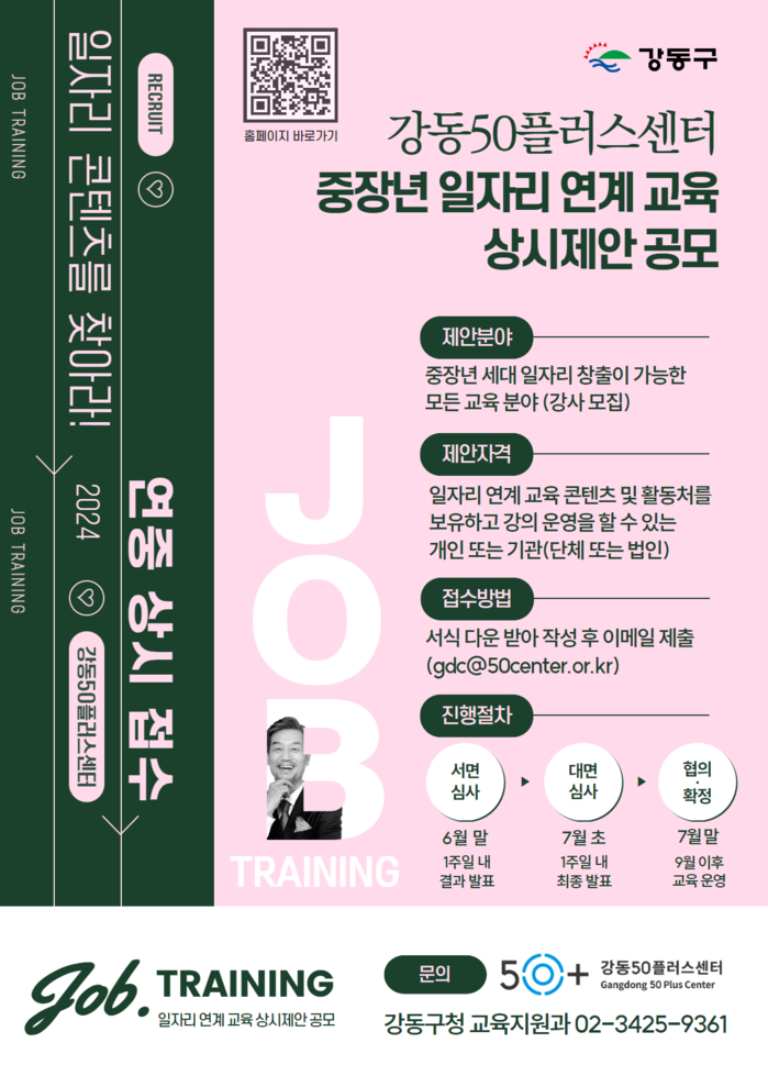 이번 공모 대상은 중장년 세대 수요 일자리를 보유하고, 해당 일자리 진입에 필요한 직무교육을 운영할 수 있는 개인 또는 기관(단체 또는 법인)이며, 강동50플러스센터에 연중 상시로 제안할 수 있다.