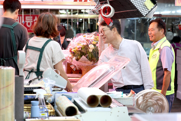| ▲ 추석 명절 전, 정원오 구청장이 마장축산물시장에 방문해 상인들과 인사를 나누고 있다. (사진=성동구청 제공) |