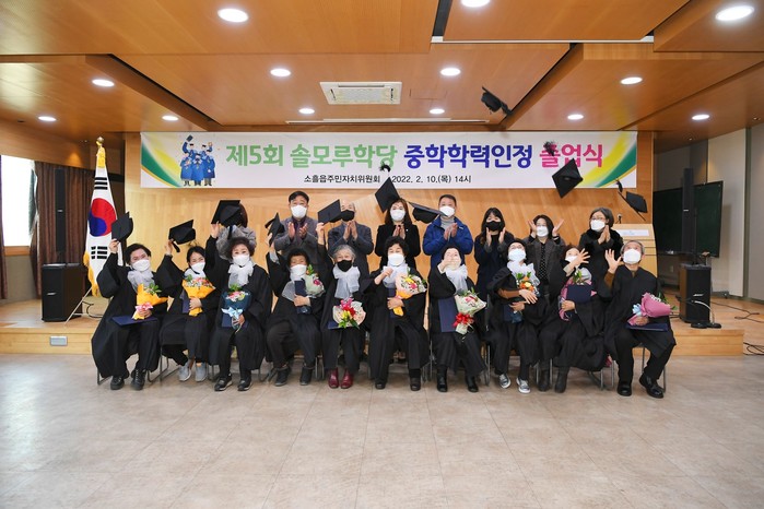 경기 포천시 소흘읍주민자치센터는 최근 성인 대상 초·중등 학력 인정 문해교육 프로그램 '솔모루 학당'의 중등 문해 교육과정 졸업식을 개최했다. 사진은 이날 중등문해교육과정 졸업생들이 졸업모를 하늘로 던지고 있는 모습. (사진제공=포천시청)