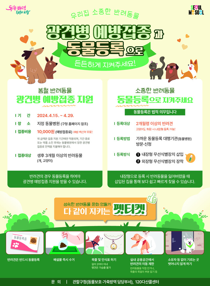 [시민일보 = 여영준 기자] 중랑구(구청장 류경기)는 오는 15~29일 봄철 광견병 예방접종을 지원한다고 밝혔다.
