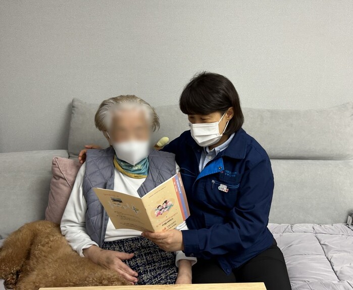 | ▲ 동작구(구청장 박일하)가 전국 최초로 도시가스 검침원과 연계한 치매 돌봄 서비스인 ‘치매도 CHECK, 가스도 CHECK’ 사업을 추진해 본격 운영에 들어갔다. 사진은 기억배지를 착용한 도시가스 검침원이 어르신의 안부를 살피며 동작구 치매안심센터 지원 서비스를 안내하고 있는 모습 (사진=동작구청 제공) |