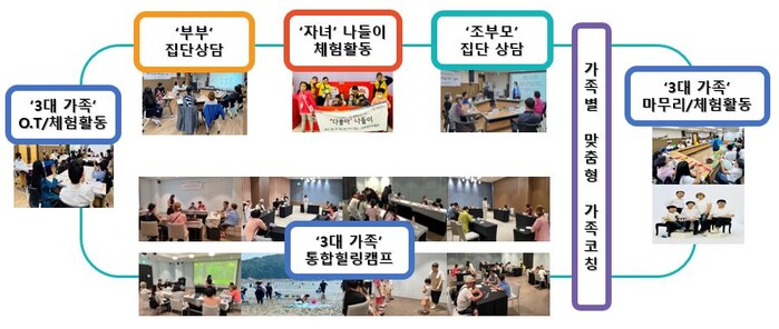 올해는 다문화가족 5가구(25명)가 참여했으며, 가족별 맞춤형 코칭프로그램인 ▲'조부모' 집단상담 ▲'부부' 집단상담 ▲'자녀' 친구들과의 나들이 체험활동 ▲'3대가족' O.T 및 체험 활동 ▲'3대가족' 통합 힐링캠프 ▲일대일 전문상담 등을 진행했다.