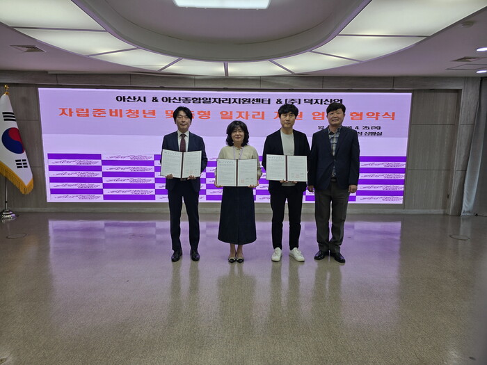 김민숙 아동보육과장은 “취업교육과 일자리 제공으로 자립에 큰 힘이 될 것이며, 흔쾌히 협약해 주신 아산시종합일자리지원센터와 ㈜덕지산업에 감사드린다”며 “앞으로도 자립준비 청년의 안정적 일자리 제공과 사후관리 등 실질적 자립 지원에 노력하겠다”고 말했다.