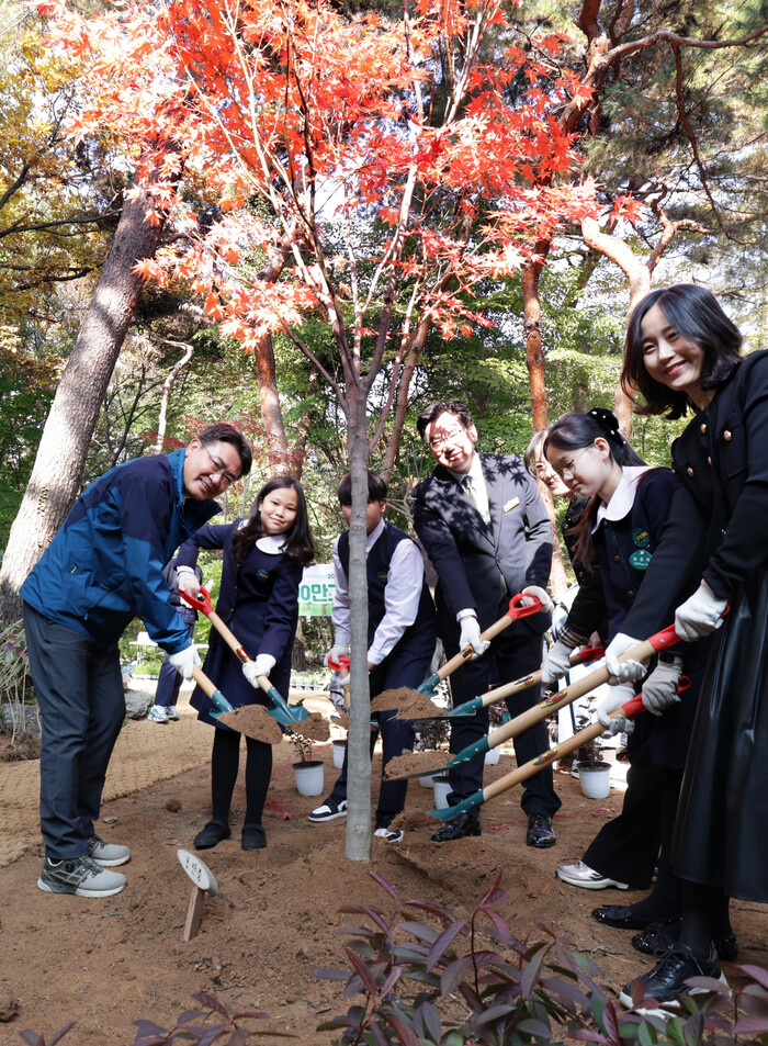 서울 노원구가 최근 화랑초등학교에서 ‘100만 그루 나무심기’ 행사를 진행하고, 학생들과 함께 나무를 심으며 탄소중립 실현의 의미를 공유했다. 이날 식재된 나무는 병꽃나무, 덜꿩나무, 수수꽃다리, 무궁화 등 탄소 흡수 효과가 뛰어난 수종으로 구성됐다. 사진은 행사에서 오승록 구청장(맨 왼쪽)이 학생 및 관계자들과 함께 나무를 심는 모습. (사진=노원구청 제공)