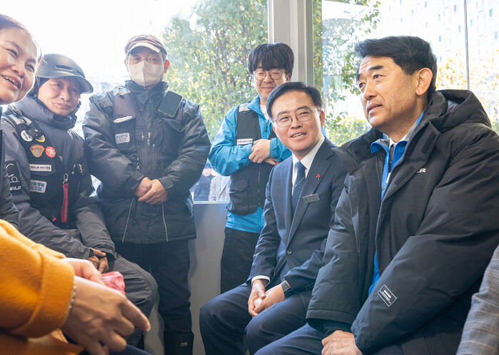 | ▲ 진교훈 구청장(오른쪽 두 번째)이 쉼터 안에서 플랫폼노동자들과 시설을 둘러보며 이야기를 나누고 있다. (사진=강서구청 제공) |