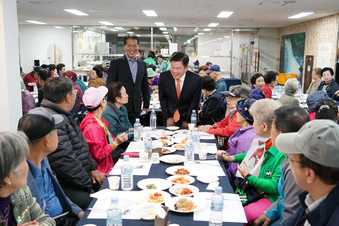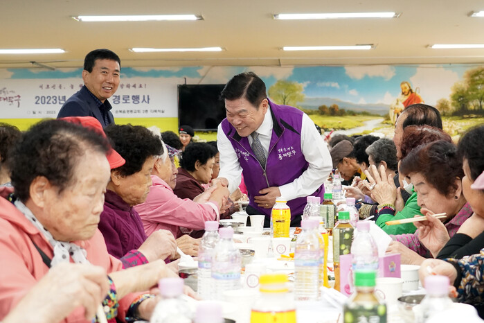 | ▲ 서울 동대문구가 경로의 달을 기념해 지난 한달간 동별 경로행사를 성공적으로 개최했다. 사진은 이문2동에서 열린 경로잔치에 참석한 이필형 구청장 (가운데)가 노인들과 악수를 하고 있는 모습.(사진=동대문구청 제공) |