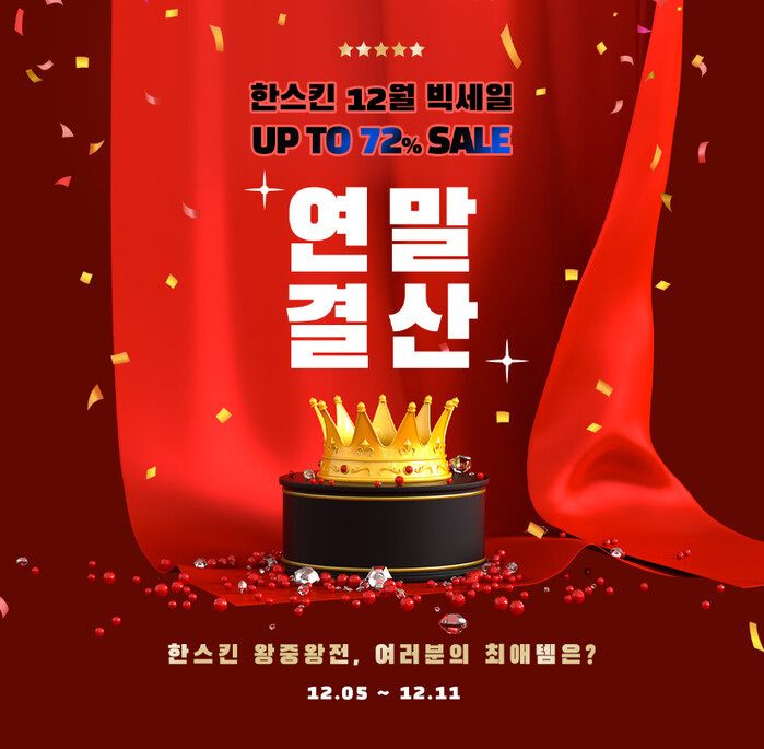 또한 ‘올해의 진정왕’으로 선정된 한스킨 순한 어성초 퍼스트 에센스, ‘올해의 보습왕’인 한스킨 세븐레이어 세마라이드 크림, ‘올해의 신상왕’으로 뽑힌 한스킨 누디씬커버 쿠션 및 리필 등을 최대 72% 할인 판매하는 ‘올해 왕중왕전’ 이벤트를 통해 올해 소비자들이 가장 사랑한 베스트 아이템을 저렴하게 선보인다.
