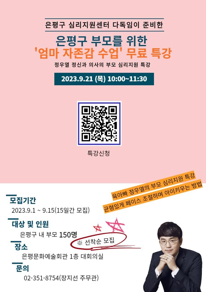 신청 대상은 은평구 내 부모이며, 인원은 150명으로 선착순 모집한다. 신청 방법은 포스터에 있는 QR로 접속하거나 은평구청, 은평구 보건소 홈페이지를 통해서도 가능하다.