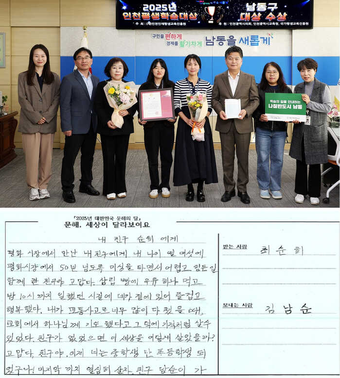박종효 남동구청장은 “이번 대상 수상과 시화전 수상은 구민과 학습자, 활동가, 강사 모두가 함께 만들어낸 결실”이라며 “앞으로도 구민이 배우며 성장하고, 학습을 통해 지역의 변화를 만들어갈 수 있도록 돕겠다”라고 말했다.