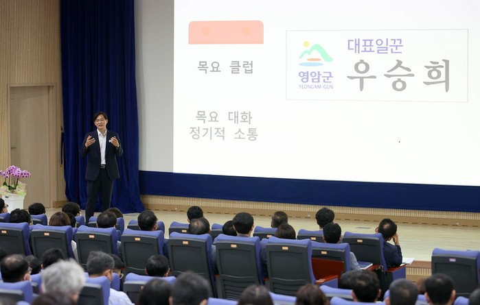 우승희 군수 취임 후 첫 번째 열린 7월 정례 조회에는 각 실과장 및 공직자 330여 명이 참석한 가운데 우승희 군수는 연설 단상 없이 직접 작성한 프레젠테이션을 활용한 브리핑 형식으로 영암의 청사진을 밝혔다.