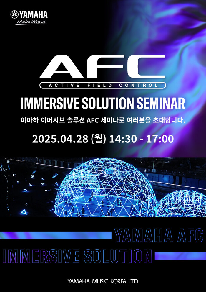 세계적인 악기 및 음향 전문기업 야마하뮤직코리아㈜(대표: 무쿠노 켄스케)가 오는 28일, 자사의 몰입형 음향 솔루션 시스템인 ‘AFC(Active Field Control)’를 소개하는 ‘이머시브 솔루션 AFC 세미나’를 개최한다고 밝혔다.