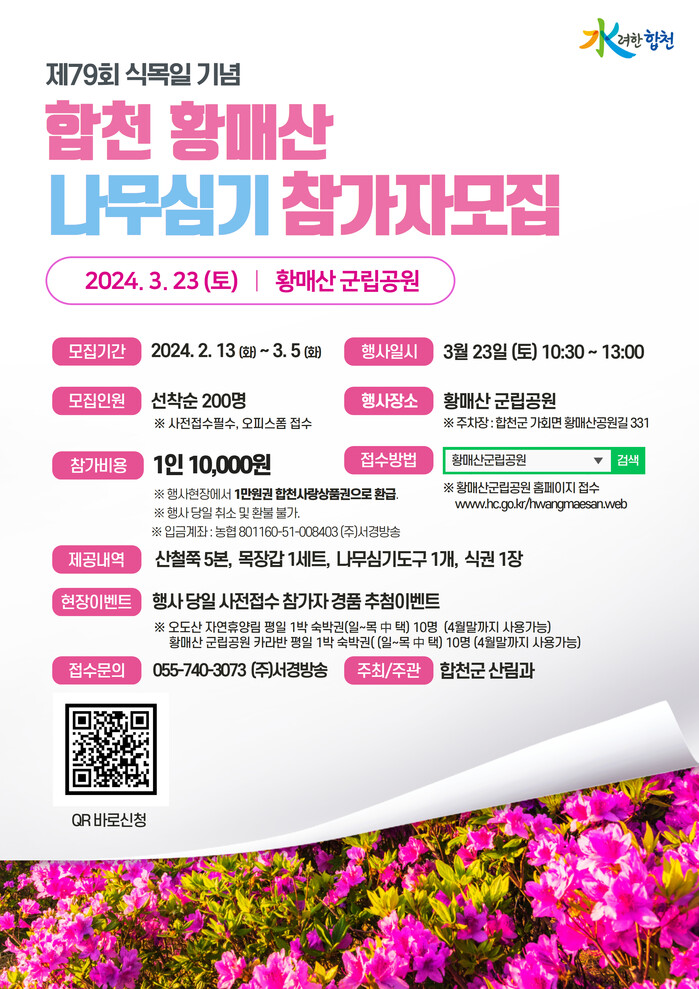 이번 행사는 황매산 사계절 힐링 관광지 조성을 위한 산철쭉 심기 행사로 2월 13일부터 3월 5일까지 참가자 200명을 모집하고 있으며, 접수 방법은 합천군 홈페이지 및 황매산군립공원 홈페이지를 통해 전국민 누구나 신청 가능하다. (19세 미만 보호자 동반신청 가능)
