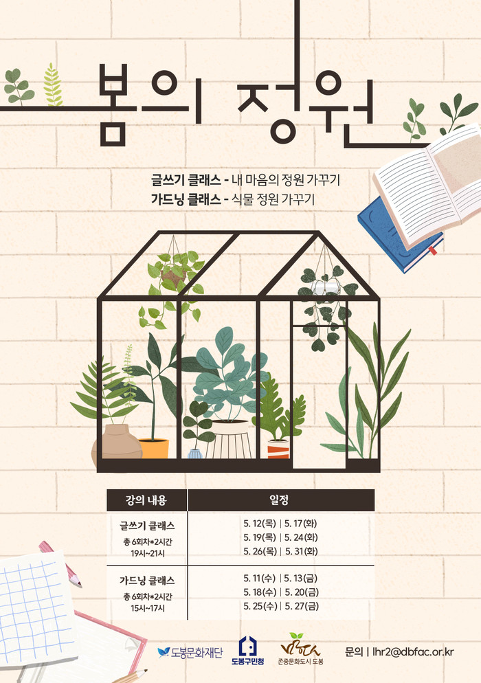‘내 마음의 정원 가꾸기’ 글쓰기 클래스는 6회차(오는 ▲5월12일 ▲5월17일 ▲5월19일 ▲5월24일 ▲5월26일 ▲5월31일)로 도봉구민청 2층 세미나실에서 진행된다. ‘시작할 용기가 없는 당신에게’의 저자 ‘리을’과 함께 정원을 가꾸듯 자신의 마음을 돌보고, 글로써 생각들을 마음속에 뿌리내릴 수 있도록 하는 법을 배워보는 시간을 가진다.