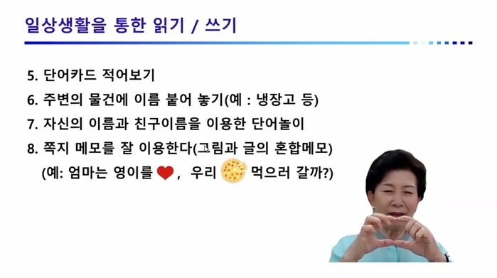 강의에서 이 상임고문은 “말과 글은 서로 연결되어 있고 언어는 지능 발달과 함께 이뤄진다”면서 “한글을 읽고 쓰기 위해서는 공간개념이 우선되어야 하며 부모와 또래 친구, 놀잇감과의 상호작용이 중요하다”고 조언했다.