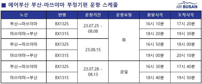 에어부산은 이번 마쓰야마 부정기편을 7월 25일부터 8월 15일까지 주 3회(화·금·일) 운항한다. 운항편은 김해국제공항에서 오후 4시 30분에 출발해 마쓰야마 공항에 오후 5시 40분에 도착하며, 귀국 항공편은 현지 공항에서 오후 6시 40분에 출발해 김해국제공항에 오후 7시 50분에 도착한다. 비행시간은 약 1시간 10분이 소요되며, 220석 규모의 A321-200 항공기가 투입된다. 운항기간과 요일에 따라 출발 시간은 상이하며 상세 운항 스케줄은 에어부산 홈페이지나 모바일 웹·앱을 통해 확인할 수 있다.