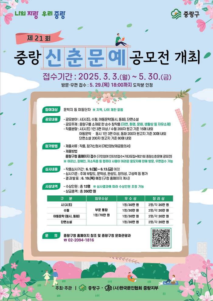 류경기 구청장은 “매년 개최되는 ‘중랑 신춘 문예 공모전’이 지역 문학 발전과 신인 작가 발굴에 기여하고 있다”라며 “올해에도 많은 시민이 참여해 자신의 문학적 재능을 마음껏 펼치길 바란다”고 말했다.