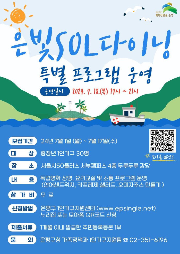 신청 방법은 은평구 1인가구지원센터 누리집에 접속하거나 해당 포스터를 참고해 QR코드로 신청하면 된다.