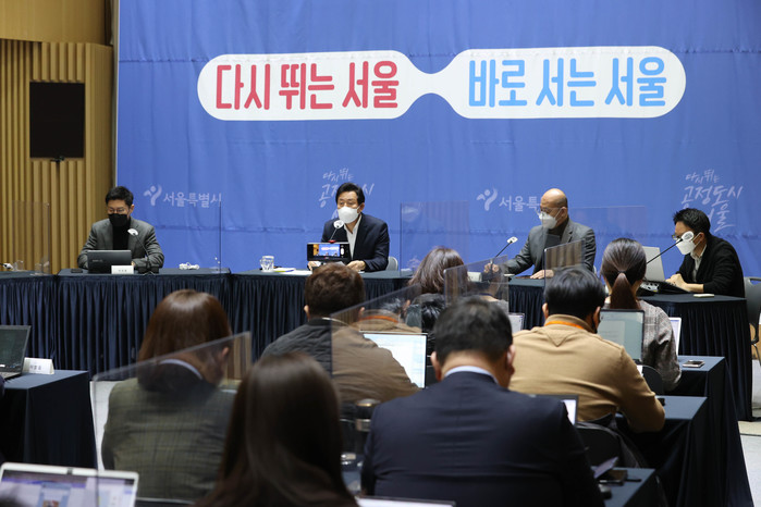 7일 오전 서울시청에서 서울시 출입기자단과의 신년간담회가 개최됐다. 이날 오세훈 시장은 서울 대중교통 요금 인상에 대해 "현재 요금 인상 계획은 없다"고 선을 그었다. 사진은 간담회에 참석한 오세훈 시장(앞쪽 왼쪽 두 번째)이 발언을 하고 있는 모습.