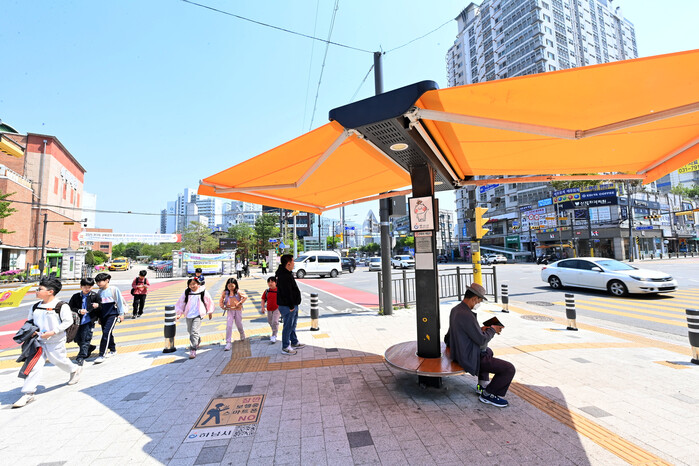 특히 어린이보호구역에 설치된 53개는 시인성이 높은 노란색 차양막으로 교체돼 등ㆍ하굣길 어린이들의 안전을 더욱 강화했다. 이는 단순히 그늘을 제공하는 시설이 아닌, 재난 대응과 교통안전, 친환경 기술이 결합된 복합 공공시설로서 새로운 공공디자인 모델을 제시한 셈이다.