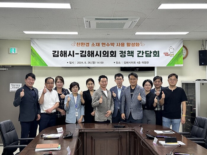 28일 시에 따르면 지난 26일 시의회 의정관에서 열린 정책 간담회에는 의회 상임위원장(행정자치위, 의회운영위), 정당 원내대표와 시 환경국장과 자원순환과장, 도시디자인과장, 김해 옥외광고물단체가 참석해 친환경 소재 현수막 사용 활성화를 위한 최선의 방안을 논의했다.