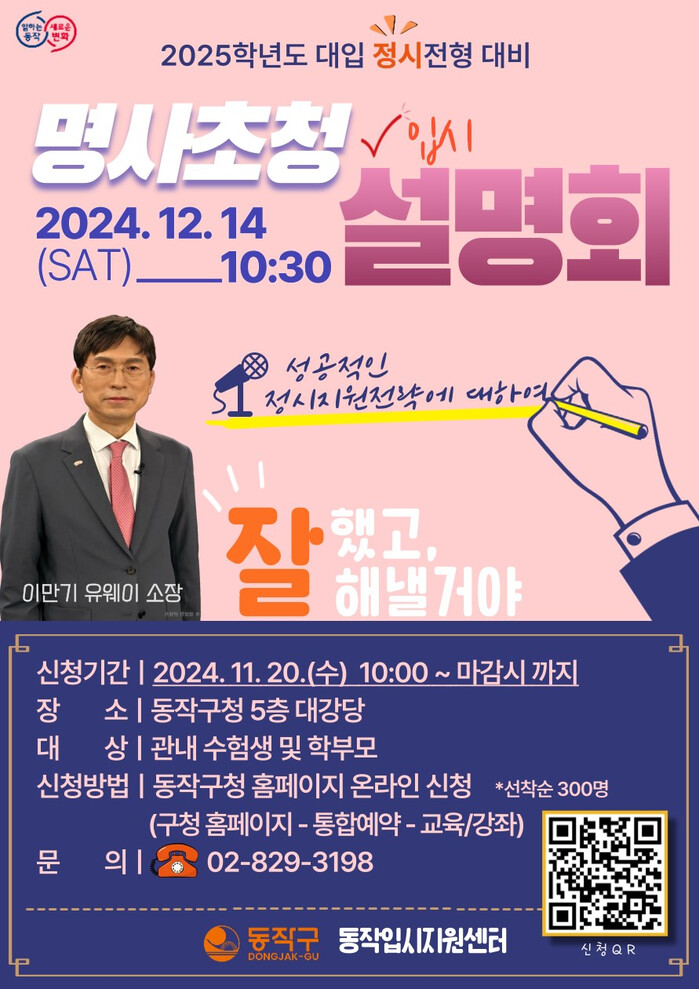 [시민일보 = 여영준 기자] 서울 동작구(구청장 박일하)는 2025학년도 수능을 마친 수험생들을 위해 오는 12월14일 구청 대강당에서 ‘정시전형 대비 명사초청 입시설명회’를 개최한다고 밝혔다.