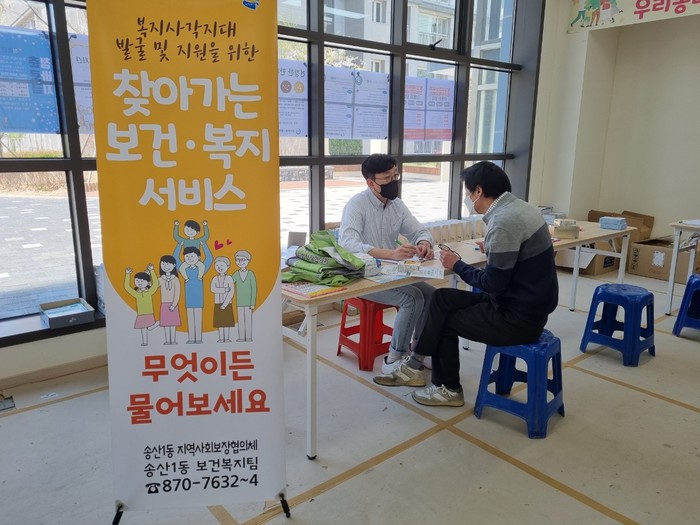 경기 의정부시 송산1동 주민센터가 최근 의정부 한신더휴고산NHF아파트에서 민·관 협력을 통해 종합적인 상담을 받을 수 있는 찾아가는 복지상담 부스 ‘무엇이든 물어보세요’를 운영해 복지상담 및 위기가구 신고 홍보 등을 진행했다. 사진은 이날 부스에서 주민들과 상담을 하고 있는 모습. (사진제공=의정부시청)