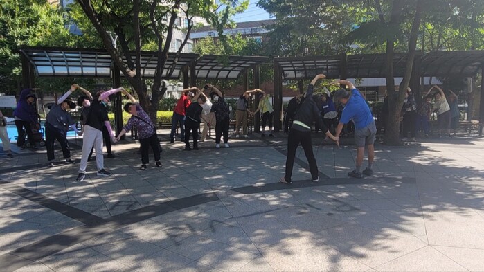| ▲ 프로그램에 참여한 어르신들이 본격적인 걷기에 앞서 준비 운동을 하고 있다. (사진=중랑구청 제공) |