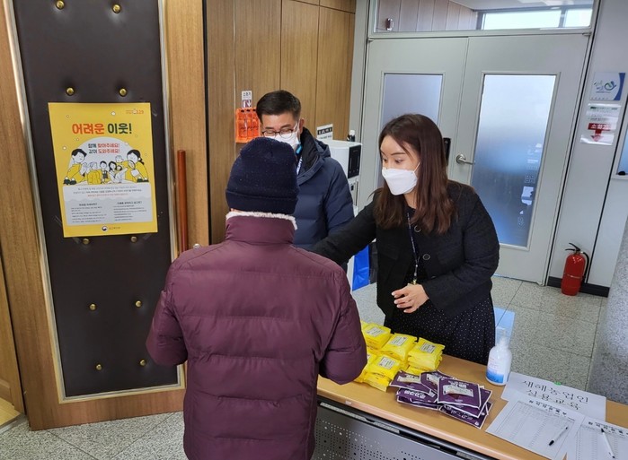 경기 양평군 강상면이 최근 새해 영농교육 참석 주민을 대상으로 복지정보가 부족해 혜택을 받지 못하고 있는 지역내 복지사각지대 발굴을 위한 홍보 캠페인을 펼쳤다. 사진은 면 관계자들이 이날 주민들에게 홍보물품을 전달하며 캠페인을 전개하고 있는 모습. (사진제공=양평군청)