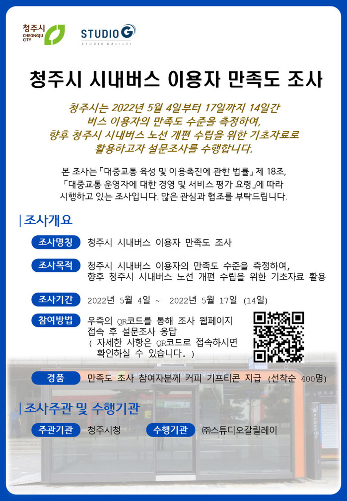 만족도 조사는 시청 홈페이지를 통해 웹페이지로 접속이 가능하며, 버스내부와 버스정보안내기 홍보물의 QR코드를 활용해서 모바일로도 접속이 가능하다.