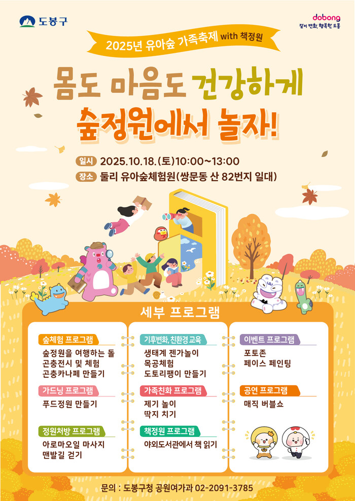 [시민일보 = 문민호 기자] 서울 도봉구(구청장 오언석)가 오는 18일 오전 10시부터 오후 1시까지 둘리 유아숲체험원(쌍문동 산 82 일대)에서 2025년 유아숲 가족축제를 개최한다.